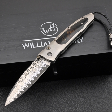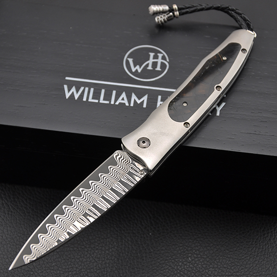 航天级钛刀柄框架 镶嵌10000年前猛犸象牙化石 手工锻造的波浪纹大马士革 ZDP-189夹钢。一面按钮及螺旋柱镶嵌二颗天然黑钻石 全球限量20只 编号10 性价比很高 简洁高配置
