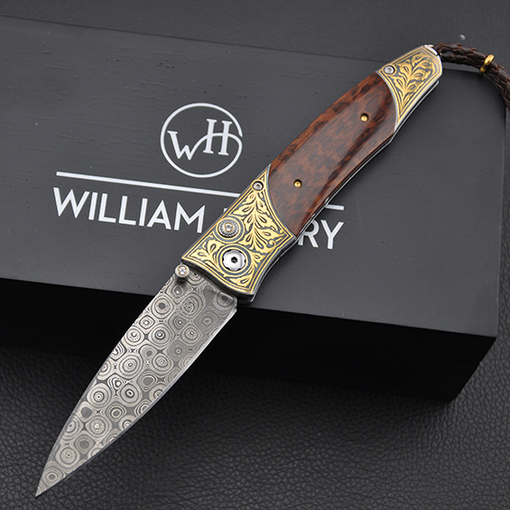 B30 Snakewood Gold’ 24K黄金雕花刀柄镶嵌蛇纹贴片 。刀片由Raindrop' 手工锻造的雨滴纹大马士革,一面按钮及螺旋柱镶嵌二颗天然宝石。全球限量50只 刀片长度:3.25" (82.5mm) 握柄长度: 3.80" (96.5mm) 全长。 :7.00" (177.8mm) 限量50编号38 ; ; ; ; 上一款:威廉亨利B04 FILAMENT "长丝"限量250编号19号 下一款:威廉亨利C15 BARRACUDA“梭鱼”