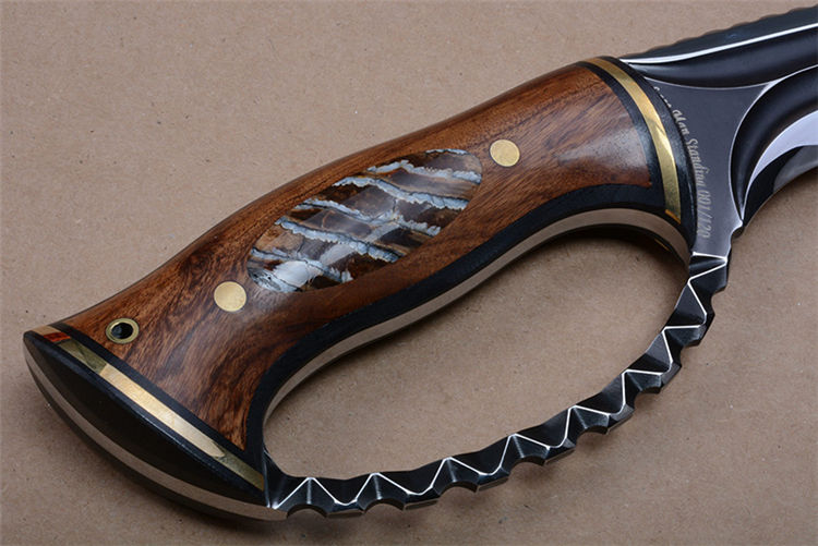 刀柄使用一整块厚度12毫米的G10镂空作为框架,镂空部分使用沙铁木接入,然后沙铁中部再镶嵌万年猛犸臼齿化石。