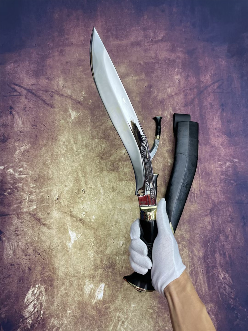 全长约47cm左右(纯手工锻打。手工制作略有偏差。属于正常),刀背厚约0.8cm。海啸是现役军刀中做工最好、外形最漂亮的一款军刀,刀身打磨成镜面,同时刀尖穿刺力极强。海啸兼具了砍、削、刺的功能,是一款华丽和实用兼备的军刀。廓尔喀旅是拥有百年历史的传奇雇佣兵团,廓尔喀军刀是他们最著名的装备。