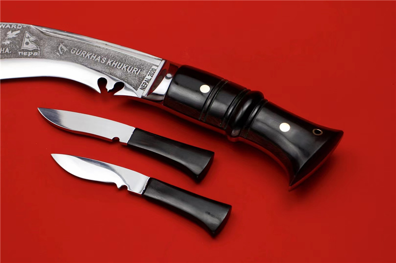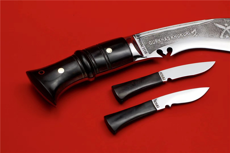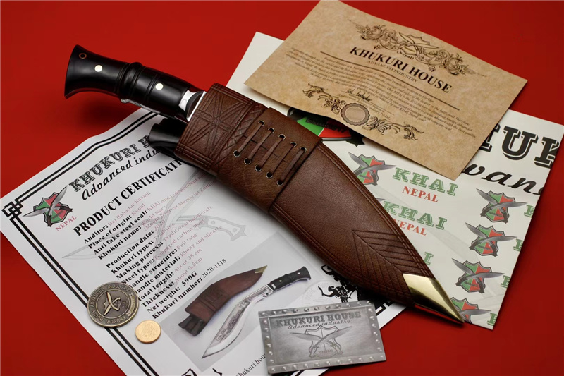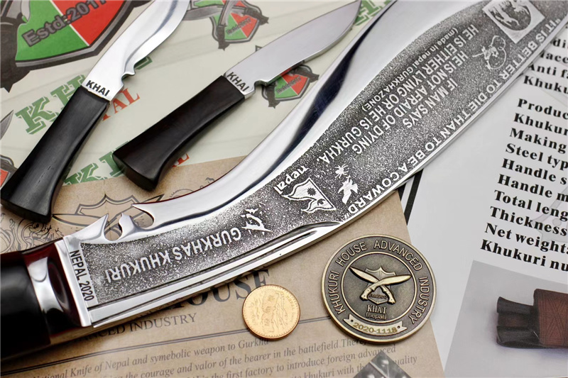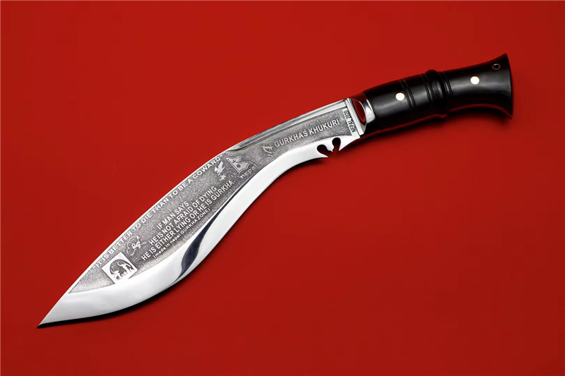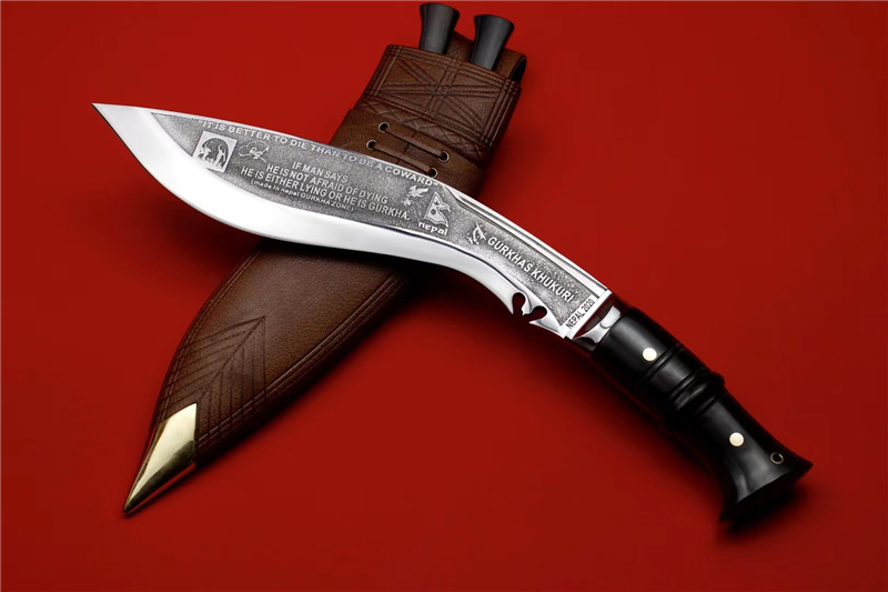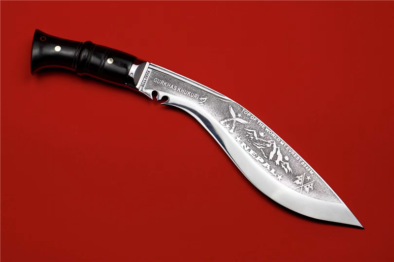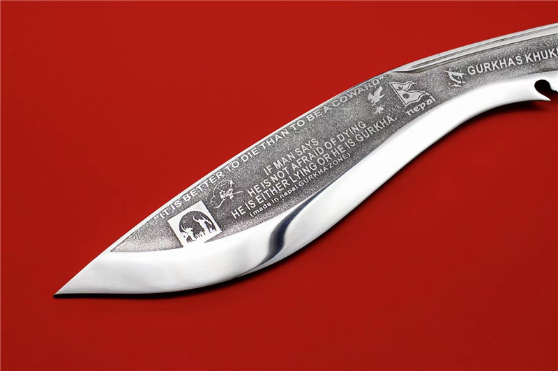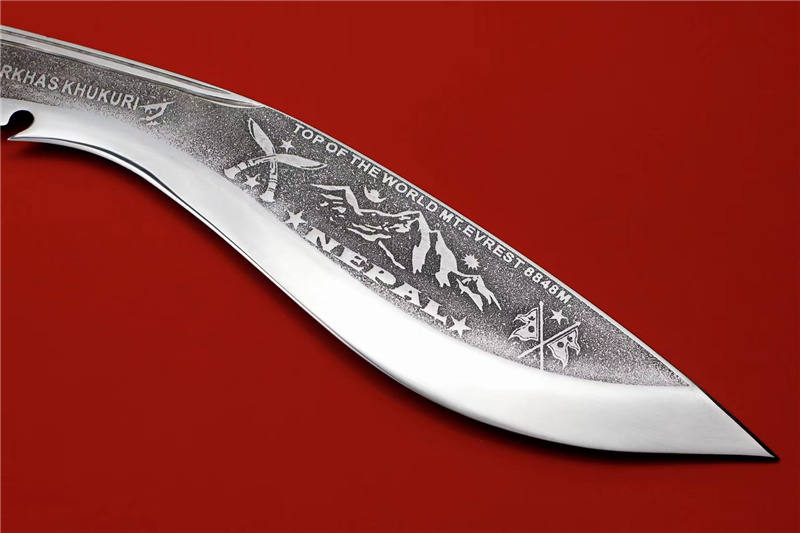 刀身左侧蚀刻廓尔喀士兵座右铭“宁死不做懦夫”,右侧用于纪念世界最高峰8848米的珠穆朗玛峰。尼泊尔这个坐落在喜马拉雅山脉脚下的佛教国度,称珠峰为圣母峰,藏语名:Qomolangma;上到国家礼仪、祭祀用品,下到生活小商品,珠峰图腾随处可见,这是他们信仰,精神的支柱和灵魂的寄托。