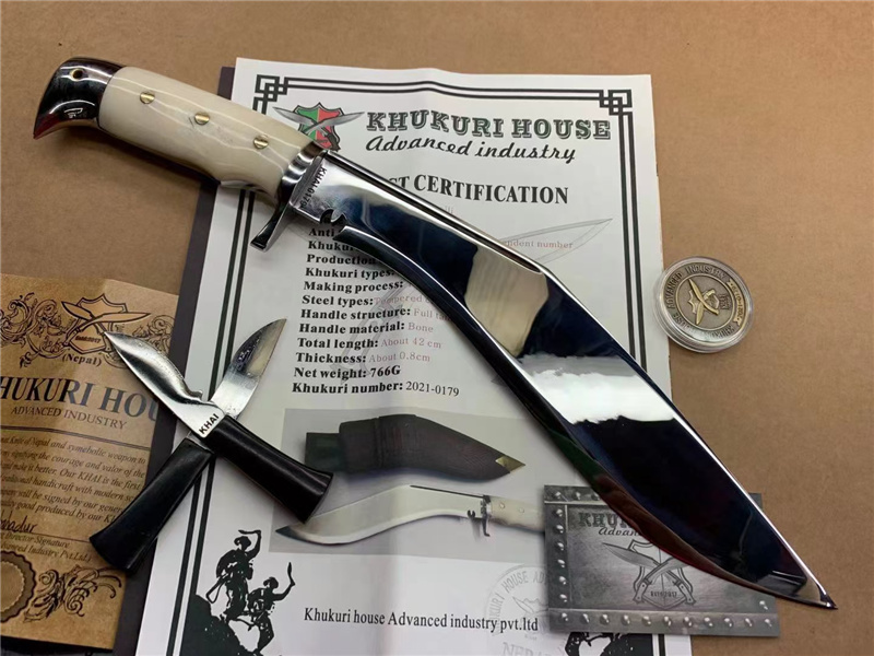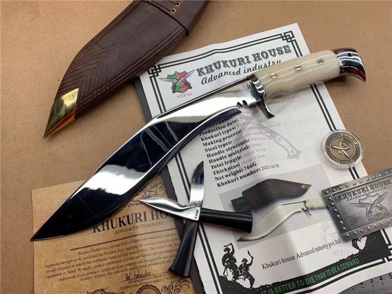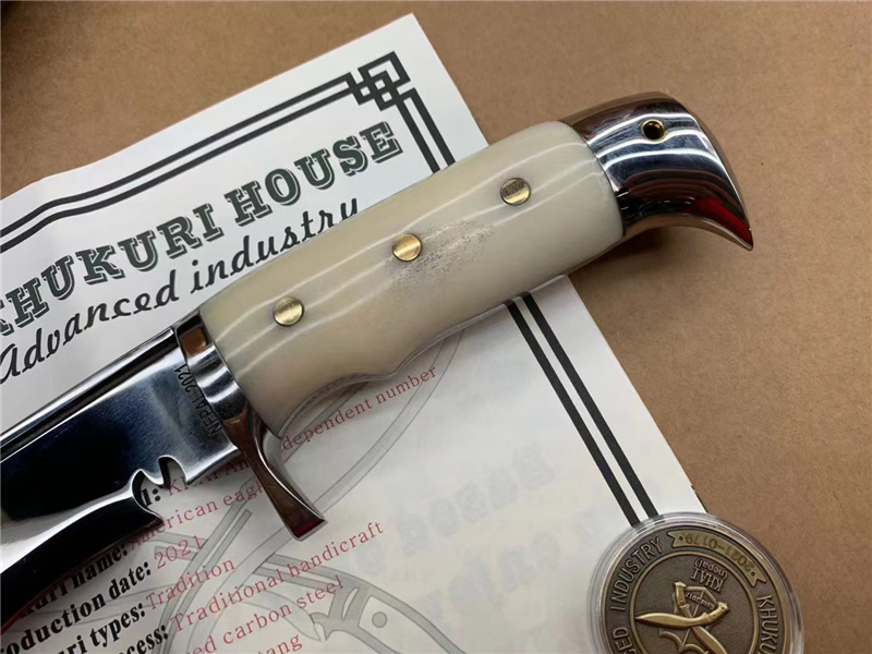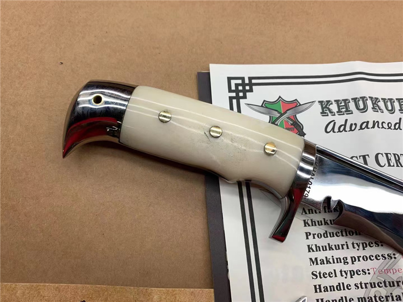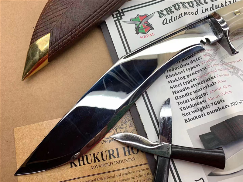 KHAI美国鹰尼泊尔狗腿弯刀 全长41-42厘米,厚度8毫米。手柄所使用的牦牛骨需要达到4厘米宽,1.2厘米厚度,该尺寸的牛骨极为罕见,说它是百里挑一毫不夸张,一款可遇而不可求的廓尔喀弯刀。 美国国鸟-白头海雕,手柄的尾部与鹰头极其相似,顾尼泊尔工匠为其命名为《美国鹰》刀身简约大方,朴实中透露着凶悍! 下一款:KHAI珠峰纪念版小号丛林二型狗腿弯刀