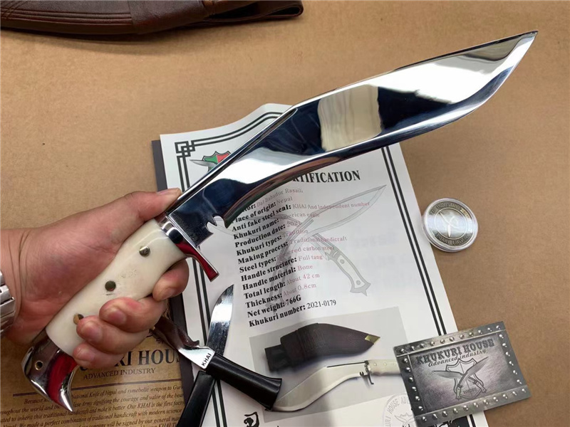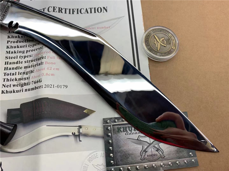 全长41-42厘米,厚度8毫米。手柄所使用的牦牛骨需要达到4厘米宽,1.2厘米厚度,该尺寸的牛骨极为罕见,说它是百里挑一毫不夸张,一款可遇而不可求的廓尔喀弯刀。